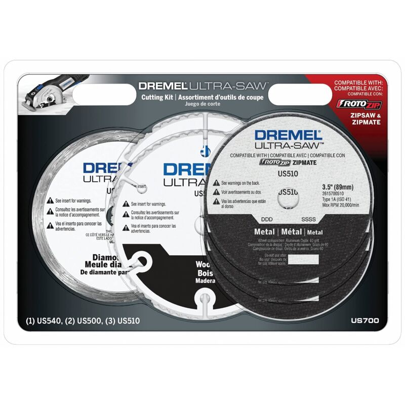 Il kit di taglio Ultra-Saw consente di tagliare una varietà di materiali tra cui legno, plastica, metallo, piastrelle, laminati e altro ancora. Il kit include: (1) ruota diamantata US540, (2) ruota da taglio per legno US500, (3) ruote da taglio in metallo US510. Sei ruote da taglio in un comodo kit di accessori di alto valore.