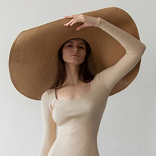 Dremokay Cappelli da spiaggia oversize a tesa larga per le donne cappello di paglia grande protezione UV parasole pieghevole cappello estivo 70CM, cachi, Taglia unica