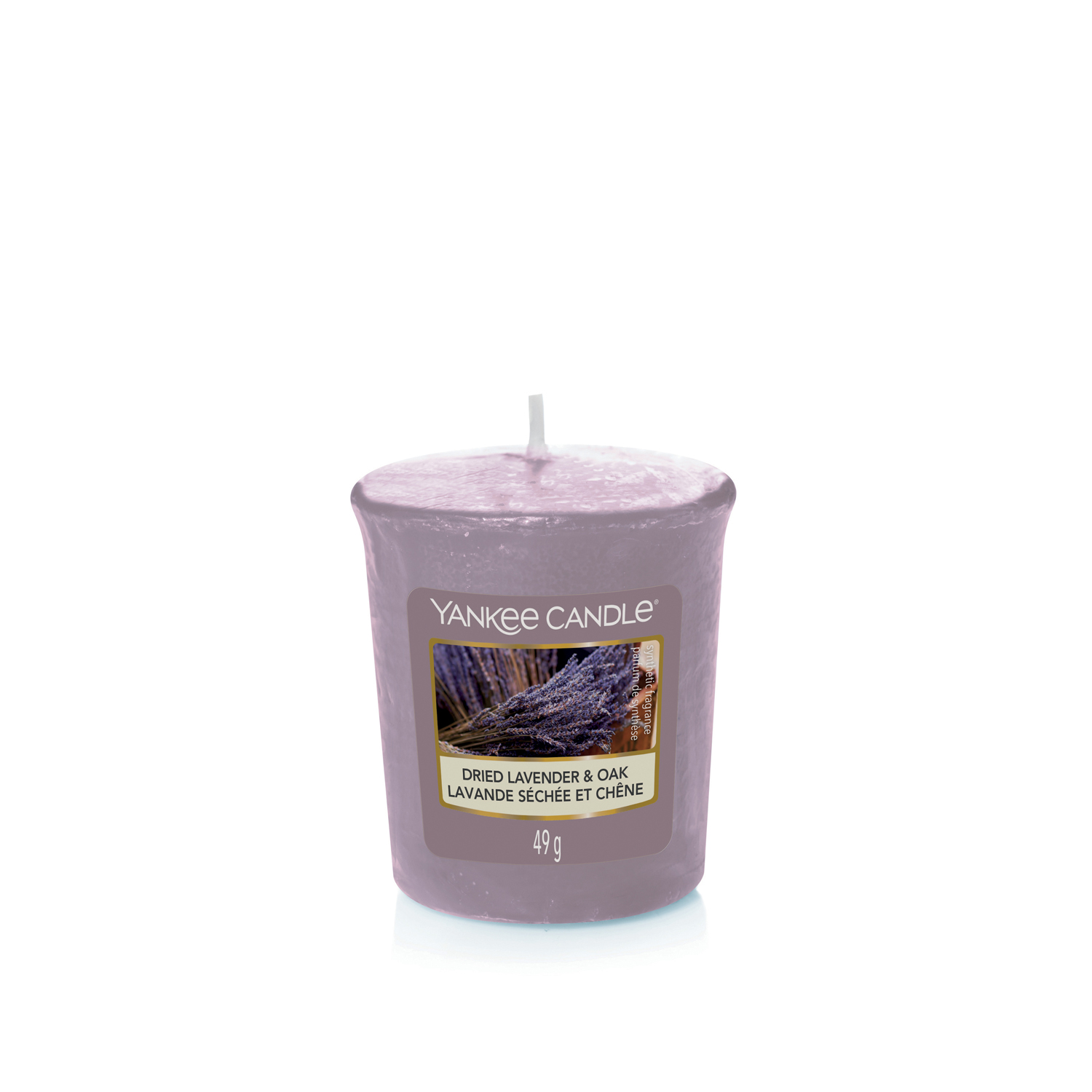 Mazzi di lavanda legati a mano che si mescolano a profumi e spezie di un mercato contadino all'aperto... sarà questa l'atmosfera che si creerà in casa tua con la fragranza Dried Lavender e Oak firmata Yankee Candle. Note di testa: Grani di Pepe Bianco, Lavanda, Bergamotto. Note di cuore: Davana, Fiori Bianchi, Muschio. Note di coda: Vaniglia, Patchouli, Legno di Cedro. Un aroma di novità avvolgerà la stanza, donando all'ambiente una vitalità inebriante e creando un'atmosfera magica con la luce soffusa di questa candelina profumata. Assicura fino a 15 ore di piacevole profumazione. Il cero votivo da 49 g è da usare con un portacandela o appoggiato su un piattino per preservare il tavolo dalla cera colata.