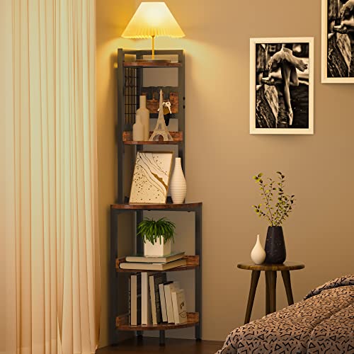 Dripex Mensola angolare a 5 ripiani, Scaffale ad Angolo, Portavasi, Libreria angolare per Ufficio, Studio, Soggiorno, Camera da Letto, Marrone Vintage e Nero, 40x40x152cm
