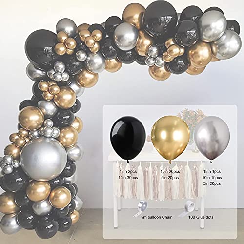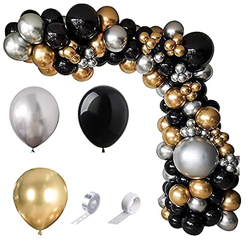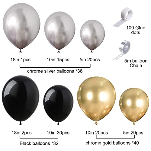 [Kit arco di palloncini in oro nero 110PCS] 20 palloncini in oro * 10 pollici, palloncini in oro 20 pezzi * 5 pollici, palloncini in argento 1pz * 18 pollici, palloncini in argento 15 pezzi * 10 pollici, palloncini in argento 20 pezzi * 5 pollici, palloncini neri 2 pezzi * 18 pollici, palloncini neri 30 pezzi * 10 pollici, Nastro a strisce per palloncini ad arco da 1pc * 16 piedi, 100 * punti di colla.