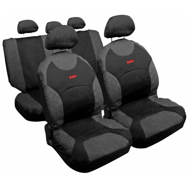 2 coprisedili anteriori, 2 coprisedili posteriori, 5 copri poggiatesta. In tessuto jeans con imbottitura in spugna