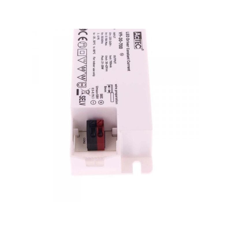 LED DRIVER ALIMENTATORE a Corrente Costante 700mA MAX 30W - Omologazione ENEC e CE - DATI TECNICI: Input: 220 - 240V AC 50/60Hz Max 0.18A Output: 30-42VDC 700mA Potenza Massima Alimentabile: 30W (da 21W - MAX 30W) Dimensioni (lunghezza, larghezza,altezza ): 120mm x 40mm x 25mm TA: da -20 a 50°C e TC: 80°C Peso: Circa 80g Connessioni a Fili sia per Ingresso che per Uscita NOTA BENE: Prima di acquistare, controllate se i dati tecnici corrispondono con il vostro alimentatore o strisce led. LED DRIVER ALIMENTATORE a Corrente Costante 700mA MAX 30W - Omologazione ENEC e CE - DATI TECNICI: Input: 220 - 240V AC 50/60Hz Max 0.18A Output: 30-42VDC 700mA Potenza Massima Alimentabile: 30W (da 21W - MAX 30W) Dimensioni (lunghezza, larghezza,altezza ): 120mm x 40mm x 25mm TA: da -20 a 50°C e TC: 80°C Peso: Circa 80g Connessioni a Fili sia per Ingresso che per Uscita NOTA BENE: Prima di acquistare, controllate se i dati tecnici corrispondono con il vostro alimentatore o strisce led.