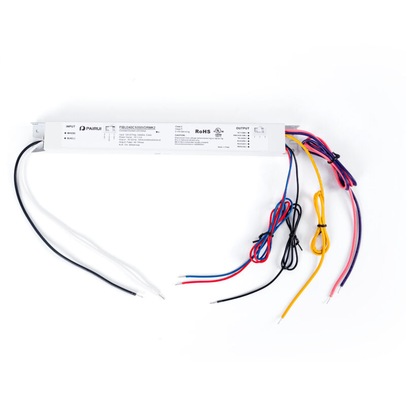 Driver per plafoniere lineari LED CCT, a corrente costante. Compatibile con i prodotti: B9040 e B9091. Multicorrente regolabile tramite dip switch: 650/800/1050mA. Controllo CCT configurabile tramite dip switch. Regolazione 0-10V e alimentatore 12V incluso.