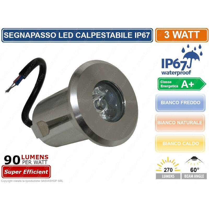 Segnapasso LED da interramento e calpestabile, con potenza di 3W. Forma Circolare con corpo alluminio e copertura del LED trasparente. LED Power SMD con fascio luminoso di 60° e flusso luminoso di 270 lm. Grazie al grado di protezione IP67, è adatta a resistere per molto tempo interrata ed esposta alle intemperie. Dotato di cassero estraibile per un facile interramento. Questo modello di segnapasso/ punto luce è disponibile con tre differenti temperature di colore: Luce Bianca Calda 3000K, Luce Bianca Naturale 4000K e Luce Bianca Fredda 6500K Dimensioni: Ø 45 x 55 mm. Dimensioni foro incasso: Ø 30 mm. Lunghezza cavo: 125 mm