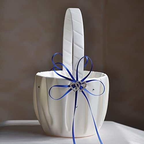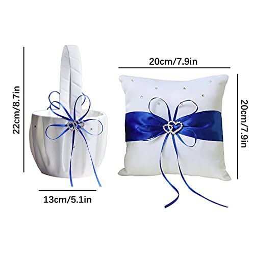 DRYEN Set di 2 cuscini per matrimonio con fiori e anelli in raso avorio con fiocco, per matrimoni, decorazione a doppio cuore con strass (blu)