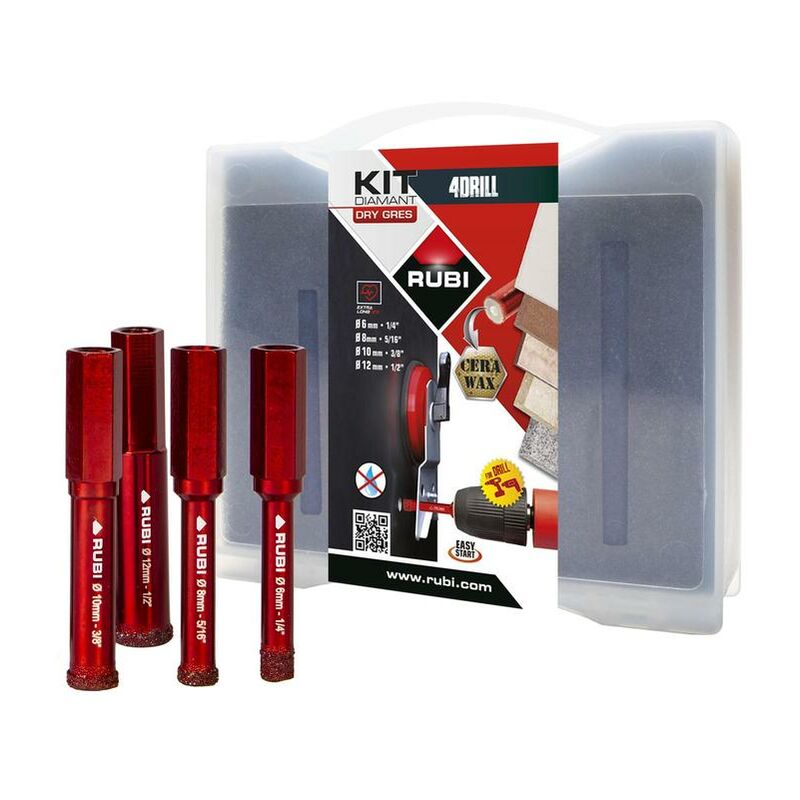 Rubi ha un kit di quattro frese diamantate drygres 4drill con una pratica custodia in plastica trasparente con una cintura a quattro colori ideale per il trasporto e la cura, prolungando la durata dell'uso del prodotto.il mini kit drygres 4drill è consigliato per la foratura di tutti i tipi di piastrelle in ceramica, in particolare il gres porcellanato e altri materiali da rivestimento come marmo e granito. nella gamma di frese drygres 4drill, rubi ha utilizzato la tecnologia di saldatura a vuoto vacuum brazed, che aumenta la resistenza alla temperatura e all'attrito, per fissare particelle di diamante sull'area di taglio. il mini kit drygres 4drill, contiene 4 frese da trapano di diametro dm 6, 8, 10 e 12 mm, ideali per posizionare accessori da bagno o qualsiasi tipo di accessorio decorativo su superfici ceramiche.le frese del mini drygres 4drill kit sono progettate per essere utilizzate esclusivamente con un trapano elettrico con o senza cavo, sempre senza percussore. la loro
