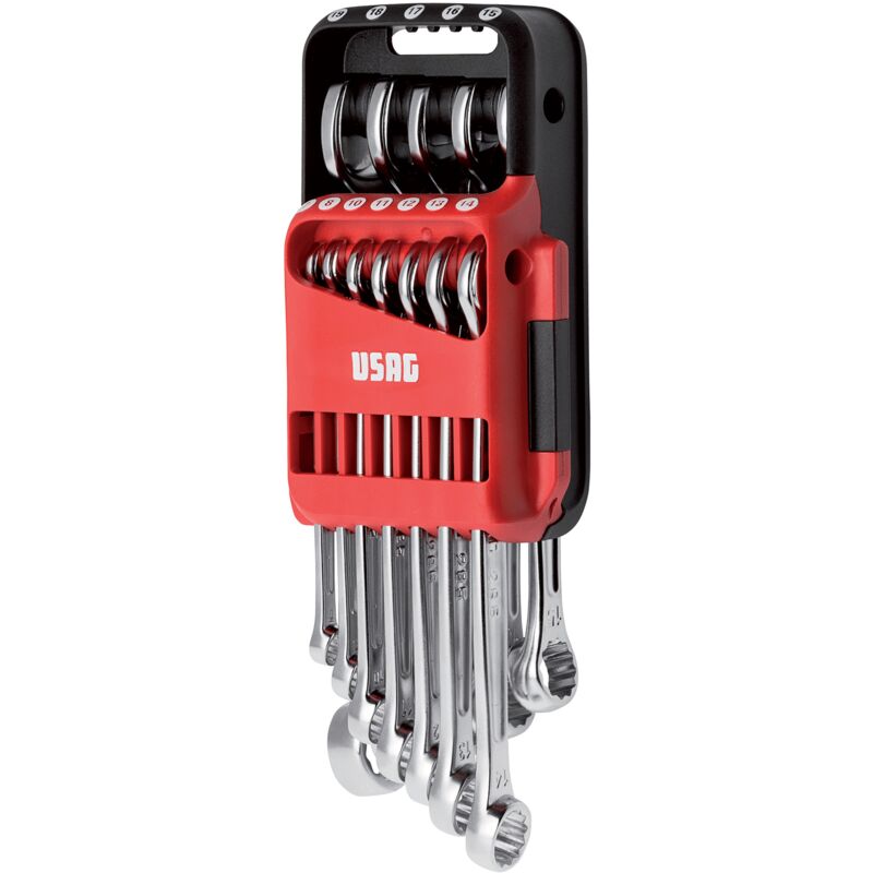 Caratteristiche serie di chiavi Usag 285 DS12: Misure: 7-8-10-11-12-13-14-15-16-17-18-19 mm Forchetta ribassata inclinata di 15° Impugnatura ergonomica Testa poligonale disassata e piegata di 15° Fornita con supporto in materiale plastico