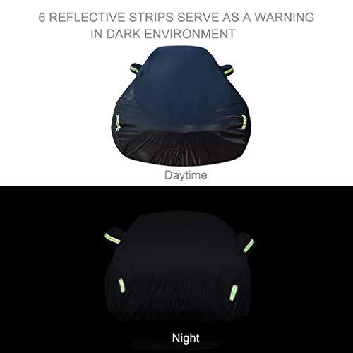 【STRISCE RIFLETTENTI】Ci sono 6 bande riflettenti notturne sulla parte anteriore e posteriore della copertura del veicolo che mostreranno chiaramente il contorno dell'auto nell'oscurità, per prevenire incidenti di collisione in ambienti bui, migliorando notevolmente la sicurezza per il parcheggio in strada di notte.