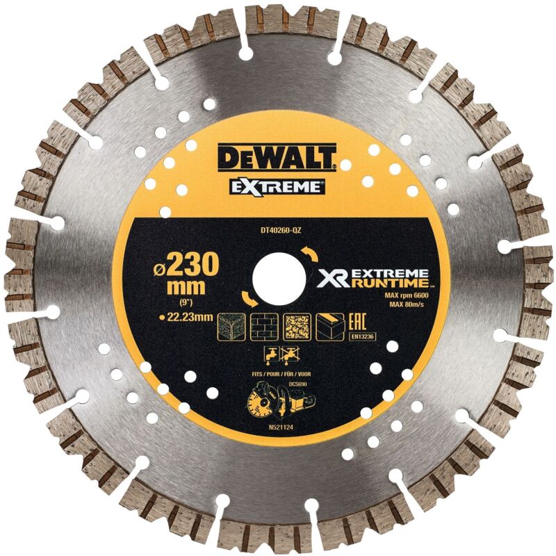 DUREVOLEZZA: lama diamantata Extreme RUNTIME progettata per un uso prolungato sulle frese per calcestruzzo. VERSATILITÀ: per il taglio di de una varietà di materiali di costruzione, tra cui lastre e cordoli. DIMENSIONE OTTIMALE: Con un diametro di 230 mm, questa lama offre il giusto equilibrio tra precisione ed efficienza. COMPATIBILITÀ: progettata per essere utilizzata con le frese per calcestruzzo da 54 V, offre prestazioni ottimali. QUALITÀ DI TAGLIO: la tecnologia de del bordo diamantato garantisce tagli puliti e precisi nelle applicazioni di costruzione de.