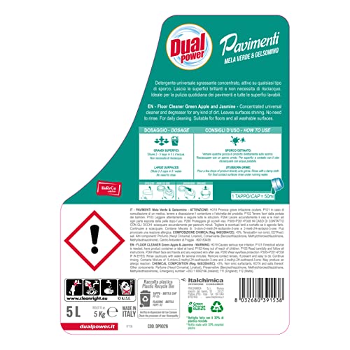 Dual Power Detergente Universale Sgrassante Per Pavimenti - Igienizzante, Scioglie Lo Sporco Ostinato - Mele Verde E Gelsomino, Neutro, 5000 Millilitro