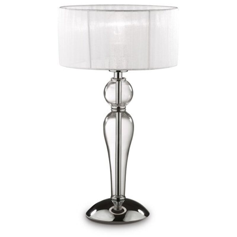 Base e dettagli in metallo cromato. Elementi decorativi in vetro soffiato e lavorato a mano. Paralume in tessuto di organza plissettato. Ø 270 x H 490 mm max 1 x 60W E27 IP:20