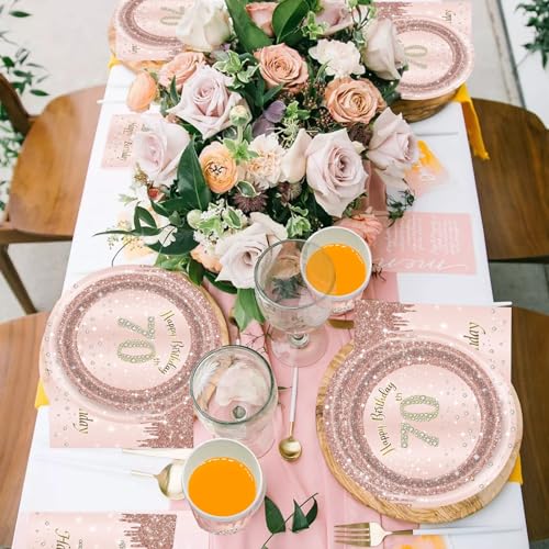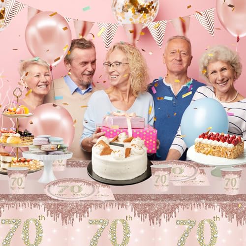DUGEHO Stoviglie Compleanno per Feste 70 anni in rosa Stoviglie Carta Set Include Piatti di Carta Tovaglioli Tazze Tovaglia, per Compleanni Matrimonio Nascita Battesimo Party ect (16 Ospiti)