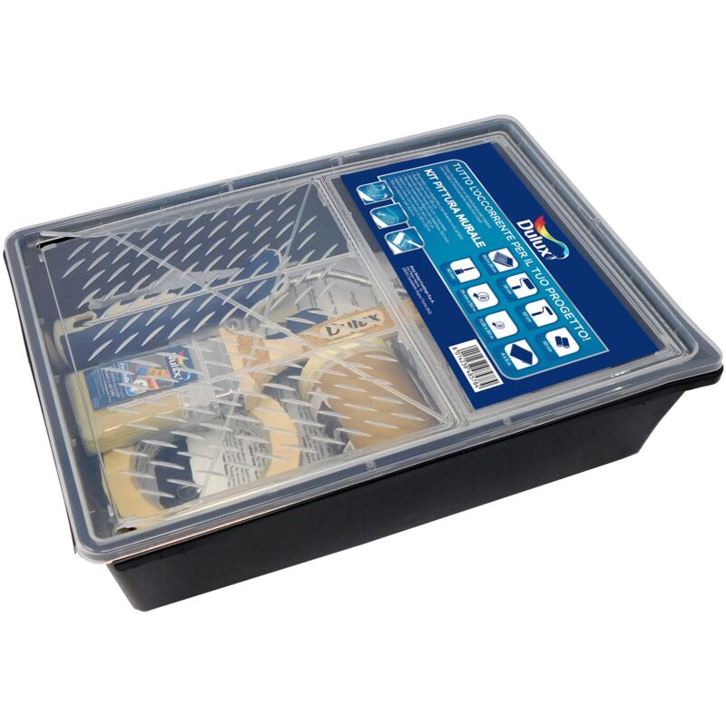 Set attrezzi per verniciare e imbiancare pareti composto di rulli, pennelli e accessori complementari quali nastro mascherante e telo copri pavimento