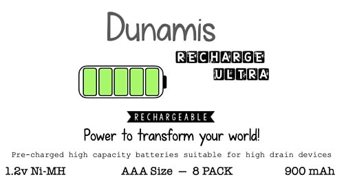 Dunamis Confezione da 8 Batterie NiMH 1.2V AAA 900mAh Ricaricabili ad Alta Capacità Adatte per Telefoni Cordless, Fotocamere Digitali, Auricolari Bluetooth e Dispositivi ad Alta Potenza