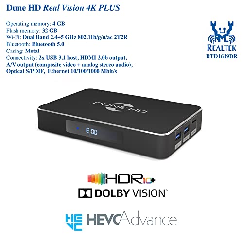 Dune HD Real Vision 4K Plus è un Media Player e Smart TV box Android con un nuovo e potente processore RTD1619 che supporta HDR10+, Dolby Vision, YouTube 4K HDR, oltre a 4Kp60, HDR, HDR10+, Dolby Vision, HDMI 2. 0b, audio HD, BD4K, BD3D, menu Blu-ray, NFS, SMB, 1Gbit Ethernet, WiFi 2.4 / 5, USB 3.1, 4GB RAM, 32GB flash, nota: le antenne devono essere installate anche se non si utilizza il Wi-Fi, questo è necessario per il controllo remoto Bluetooth