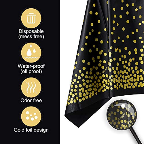 Design a pois in lamina d'oro nera: questa tovaglia a pois neri e oro è progettata su sfondo nero e motivo a pois in lamina dorata. La tovaglia è impreziosita da un attraente punto in lamina dorata. Aggiunge un tocco elegante e moderno a qualsiasi festa. Scelta perfetta per una festa a tema nero e oro.