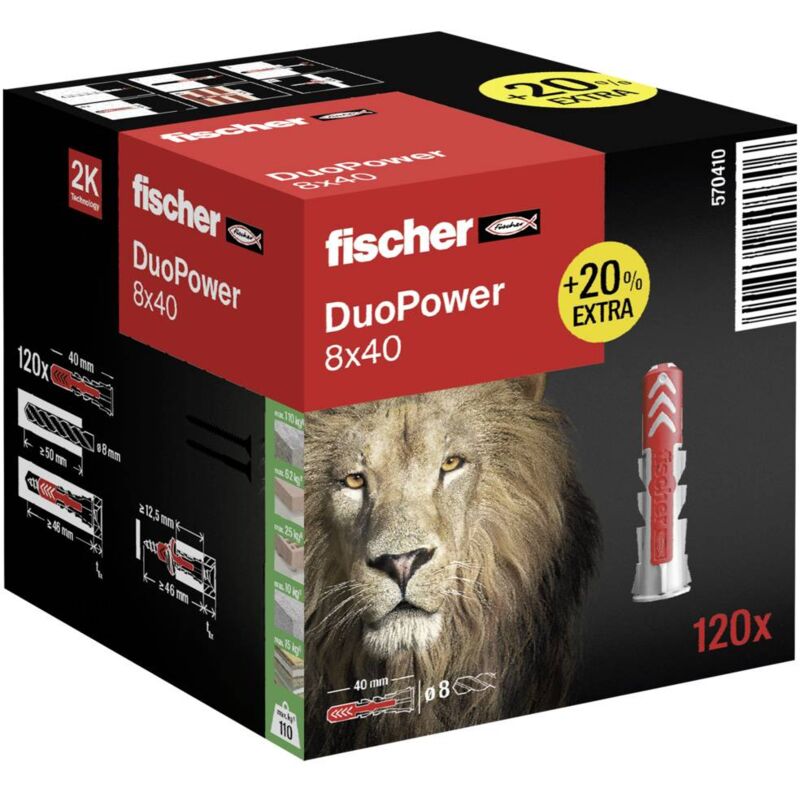Dettagli tecnici Contenuto 120 pz. Dimensione del prodotto, lunghezza 40 mm Dimensione, Ø 8 mm Dimensioni (Ø x L) 8 mm x 40 mm Materiale Poliammide Tipo prodotto Tassello a 2 componenti fischer DuoPower 8 x 40 (+20% in più di contenuto) DUOPOWER fischer offre ottimi valori di tenuta grazie ai 2 componenti: a seconda del materiale da costruzione, il componente grigio in nylon di alta qualità attiva automaticamente il principio di funzionamento ottimale (espansione, compressione) per la migliore tenuta. Le ali di dilatazione del componente rosso sostengono lo spandimento sicuro e offrono una maggiore sicurezza al componente grigio. Semplice avvitamento della vite e corretta estrazione alla fine. Nessun serraggio eccessivo della vite. Il bordo della testa del tassello impedisce che scivoli nel foro. Le viti in dotazione sono perfettamente adatte al tassello a espansione DuoPower fischer. Testo tradotto automaticamente Punti di forza e dettagli Confezione promozionale con 20% di contenuto