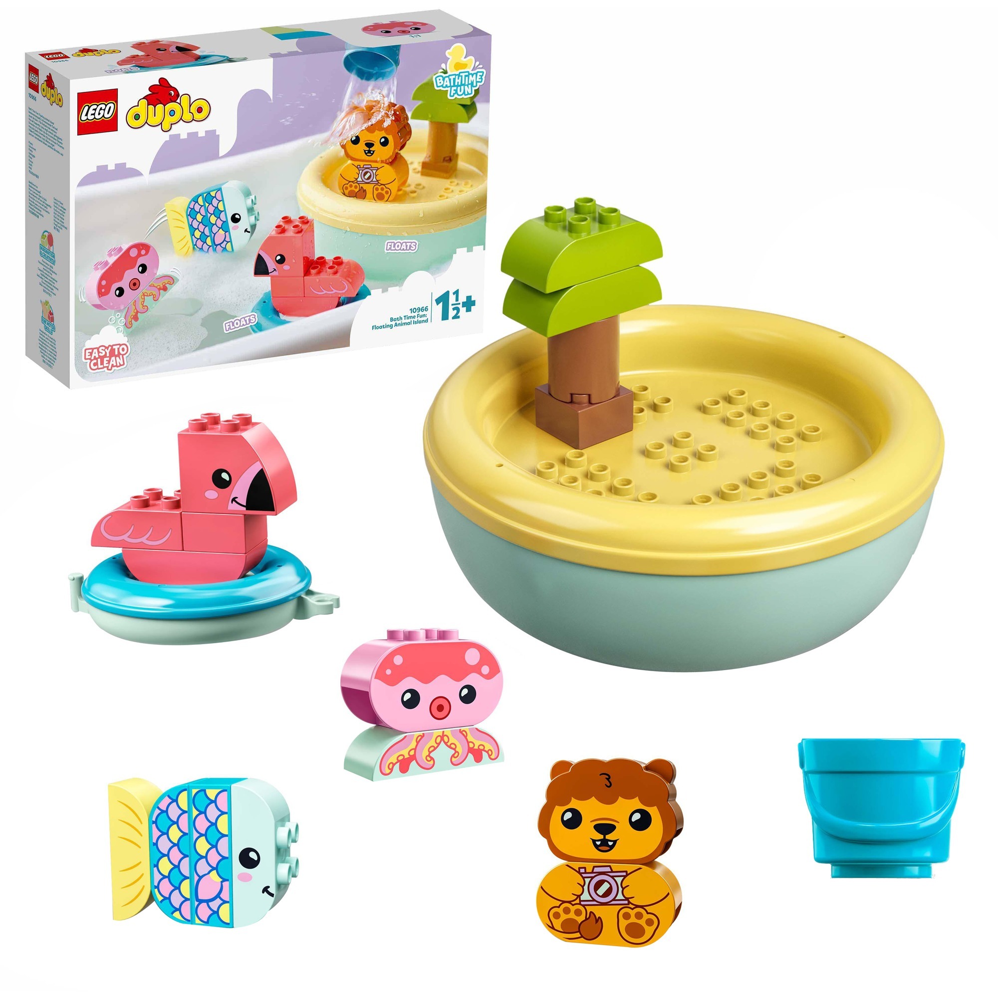 isola tropicale! Il playset include 4 animali LEGO DUPLO facili da montare grazie a 2 mattoncini: un simpatico leone giocattolo in piedi sulla sua paradisiaca isola galleggiante, un fenicottero rosa su una ciambella, un pesce e un polpo che sguazzano nell'