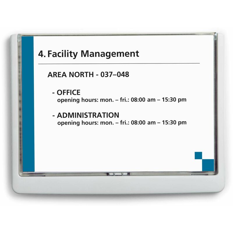 Formato A5 Materiale ABS Colore bianco Dotazione per il fissaggio viti e placchette adesive DURABLE CLICK SIGN A5 TARGA X PORTE BIANCO 4866-02 CLICK SIGN 210 X 148 5 MM (A5). TARGA PER PORTE E PARETI IN ABS CON APERTURA E CHIUSURA A SCATTO. COL. BIANCO