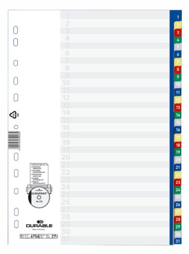 Durable 675627 - Divisorio con cavalierini colorati, etichette 1-31, 31 tasti, copertina personalizzabile, f.to A4, foratura universale