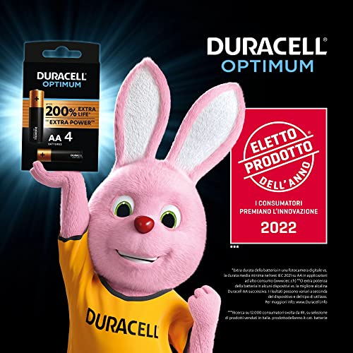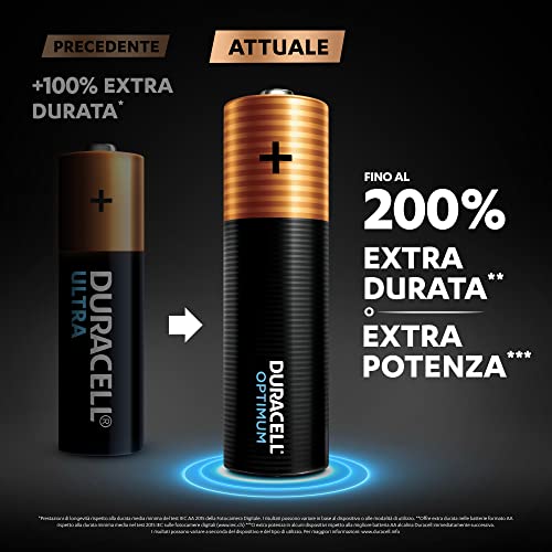 Le batterie AA Duracell Optimum offrono FINO AL 200% DI EXTRA DURATA* in alcuni dispositivi o di EXTRA POTENZA** in altri, per farti ottenere le prestazioni migliori da tutti i tuoi dispositivi.