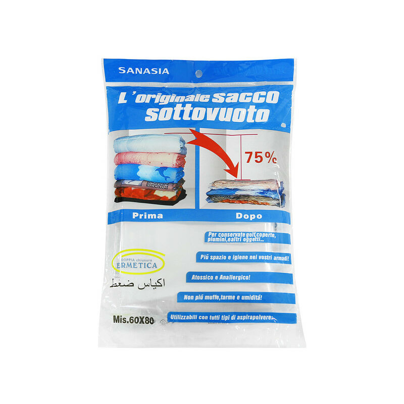 60*50cm Questo sacchetto di immagazzinaggio della guarnizione di vuoto è perfetto per tutte le vostre esigenze di storage e siVi aiuterà a risparmiare fino al 75% di spazio di archiviazione. Con queste borse di stoccaggio, è in grado di comprimere i vestiti, cuscini, plaid eBiancheria da letto di stagione Essi possono essere impilati uno sopra l' altro, è possibile risparmiare spazio prezioso inVostri armadi, soffitta, garage o in cantina. Inoltre aiutano a proteggere il vostro abbigliamento contro acqua, umidità, insetti,Falene, sporcizia, muffa e odori. Sono ideali per trapunte e coperte, cuscini, maglioni, giacche,Indumenti per la stagione e tutti gli altri oggetti ingombranti. Facile da pulire, riutilizzabile SiPuò aspirare l'aria con un aspirapolvere (non