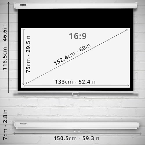 Duronic MPS60 WE 16/9 Schermo di proiezione 60” formato 16:9/133 x 75 cm telo da proiezione a sviluppo manuale - Fissaggio a muro o a soffitto - Full HD 3D 4K - Home cinema home theater ufficio