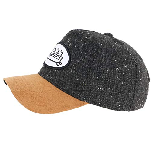 Acquista un berretto Von Dutch uomo e donna marrone e grigio antracite riferimento May, berretto baseball retro calotta effetto tweed logo Von Dutch ovale tradizionale in ricamo 3D bianco e nero, visiera in pelle scamosciata marrone sabbia vintage.