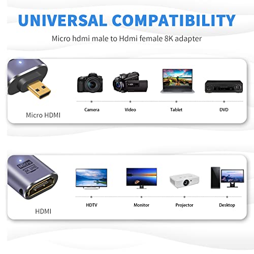 L'adattatore da micro HDMI a HDMI 8K è ampiamente compatibile con: Laptop, videocamere, fotocamere, Raspberry Pi 4, Go/pro, DSLR, tablet e altri dispositivi con porte micro hdmi.