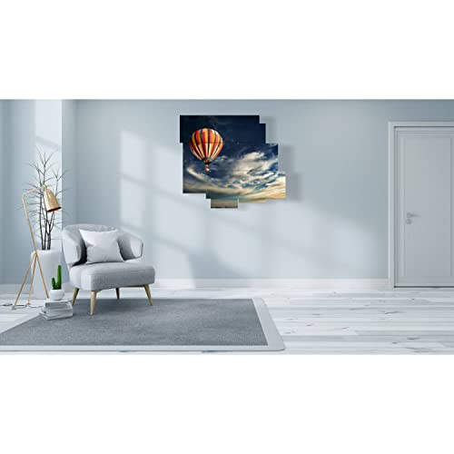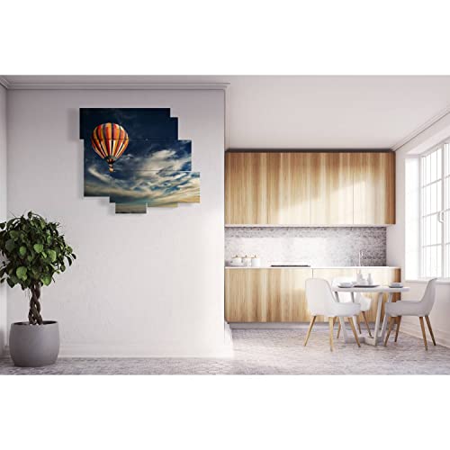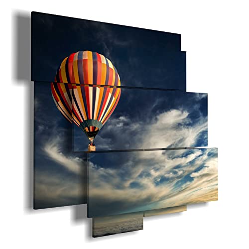 quadri mongolfiera solitaria nel cielo é un quadro moderno tridimensionale composto da 6 pannelli. Dimensione totale (LxHxS): 113cm x 99 cm x 5.6 cm. (3 verticali 3 orizzontali)