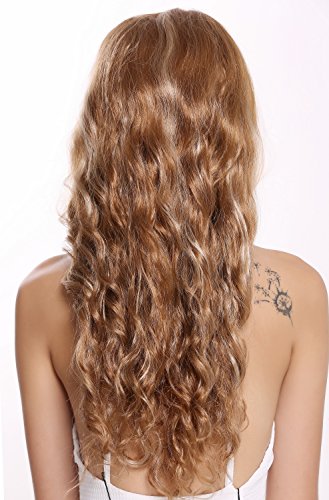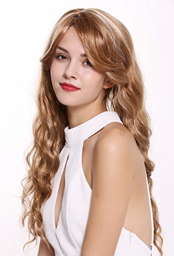 Parrucca da donna molto folta e voluminosa- i capelli biondo ramato lunghi 65 cm, con mèches biondo platino, sono rigogliosamente ondulati.