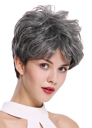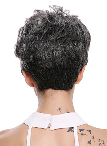 Corta parrucca da donna, voluminosa e vivacemente ondulata, in un grigio scuro con ciocche più chiare. La parte della nuca, invece, è nera.