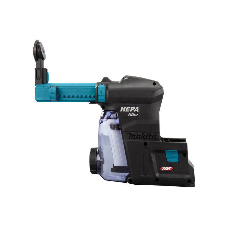 Sistema di aspirazione DX14 con filtro HEPA per lavori di foratura senza polvere con un trapano a batteria Makita XGT. Dotato di illuminazione a LED, filtro HEPA e funzione di pulizia del filtro. Il filtro HEPA H13, con un'efficienza superiore al 99,97%, garantisce la pulizia dell'aria nella stanza. Nel frattempo è possibile pulirlo grazie a una testa rotante. La profondità è regolabile fino a una profondità massima di foratura di 190 mm. La capacità del serbatoio è di 400 ml. Peso netto 1,6 kg.