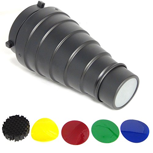 DynaSun A187 Parabola Riflettore Conico Luce Concentrato Snoot con Attacco Baionetta Bowens Completo di Griglia a Nido d'Ape e 4 Filtri Colorati