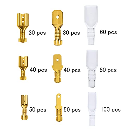 Il pacchetto include: 120 coppie di terminali a crimpare maschio e femmina da 2,8 mm / 4,8 mm / 6,3 mm + 240 manicotti isolanti. Si prega di controllare la tabella delle quantità per la quantità specifica. Un cofanetto ha un totale di 480 pezzi