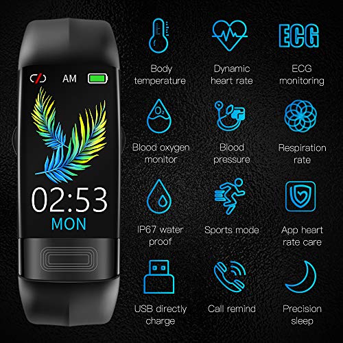 DZYQ 2020 Smart Misura di Temperatura Watch, ECG + PPG/Frequenza Cardiaca/Pressione Sanguigna/Blood Monitoraggio Dell'ossigeno, Messaggio Push Bluetooth Impermeabile Sports Tracker Fitness,Nero