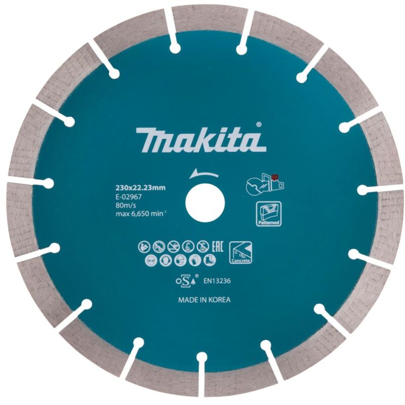 La rondella di diamante Makita 230 mm con un foro di 22,23 mm è adatta per l'uso sul calcestruzzo. Il disco Diamond può essere utilizzato per il taglio secco e bagnato.