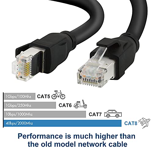 [VELOCITÀ ULTRA 40Gbps] I cavi Ethernet Cat 8 supportano una larghezza di banda fino a 2000 MHz e una velocità di trasmissione dati di 40 Gbps. CAT 8 è la scelta migliore per giochi online, download, streaming video e musica e alta efficienza sul lavoro