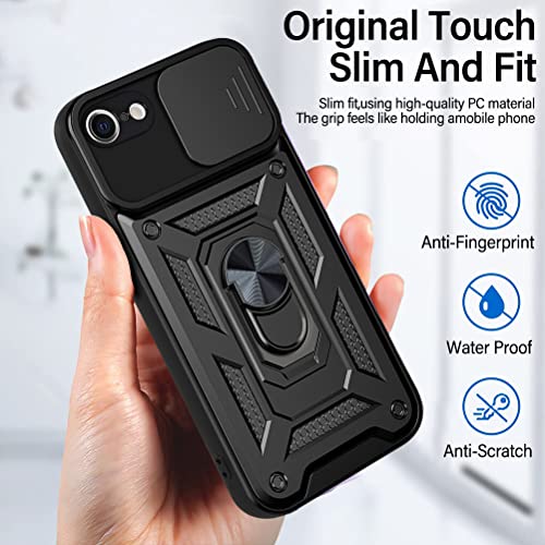 E-Lush Cover per iPhone 7/ iPhone 8, Custodia con Scorrevole Protezione Fotocamera per iPhone SE 2020/ SE 2022 Supporto Magnetica Anello Rotante Difesa Militare Hard PC e TPU Bumper Case Nero