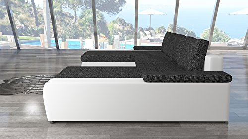 E-MEUBLES Divano angolare XXL a U panoramico letto convertibile con cassettiera 6/7 posti, in tessuto e similpelle, soggiorno e soggiorno, Larino (beige chiaro + nero (Berlino 01 + Soft 11))