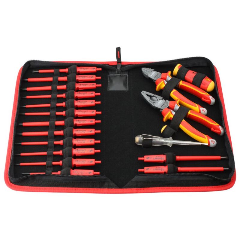 Sacca per utensili VDE. 19 parti e-smart in zip-bag. Set di lama intercambiabile VDE 14 lame intercambiabili IEC con impugnatura a 2 componenti in un sacchetto pratico in nylon con cerniera. Castino rotante piccante e zona di rivestimento morbido per l'uso come strumento di precisione. Più sicuro delle lame sotto controllo. Estrarre il blocco automatico contro indesiderato. Strumento di sicurezza secondo Din ISO 60900. Tutti i cacciaviti controllati con 10.000 volt Blade 14x: 2.5x0.4 / 3.0x0.5 / 3.5x0.6 / 4.0x.8 / 5.5x1.0 / 6.5x1.2Ph 1 / / pH 2. Pz 2. TX 10 / TX 15 / TX 20. H 2. Z 2. 1 x manico 95x32. 1 x cappuccio rotante. 1 X Strato di combinazione 180 mm. 1 x cutter laterale 160 mm. 1 tester di tensione X 3.0x70. Sacca di nylon