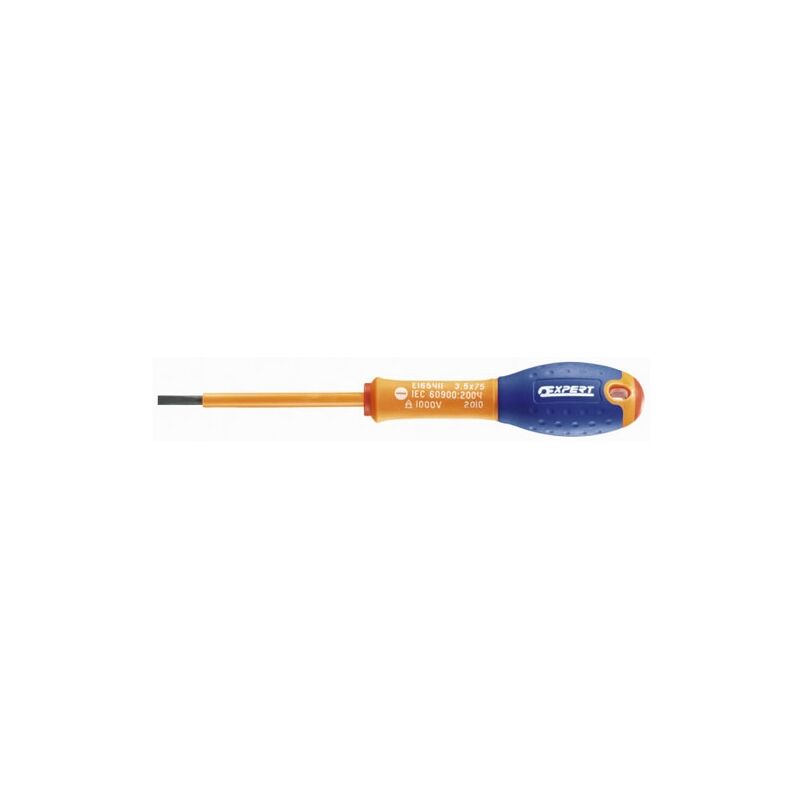 CACCIAVITE PIATTO ISOLATO EXPERT 65x150x12 Descrizione: - IEC 60900 - ISO 2380 - 1 - ISO 2380 - 2 - Comoda ed efficace impugnatura ergonomica bimateriale. - Codice colore impronta: rosso. - Ogni prodotto è testato sotto 10.000 Volt. - Lama tonda brunita con isolamento in PVC arancione. -d manica [mm]: 40 - Manico a L [mm]: 266 - Lama L [mm]: 150 Vecchia referenza: OUE165420