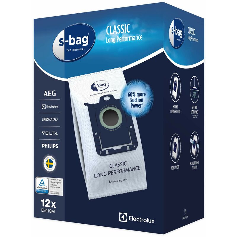 Descrizione Mega pacco da 12 sacchetti s-Bag Classic Long Performance E201SM. Compatibili con modelli ELECTROLUX. Garantiscono una vita utile superiore del 50%. Potenza di aspirazione aumentata del 60%. Contenuto della confezione 12 sacchetti per aspirapolvere originali S-bag Classic Long Performance
