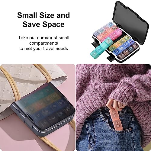 【Compacto y apto para viajes】Con unas dimensiones de 24,5 x 15,8 x 4 cm, este pastillero es compacto y cabe cómodamente en su bolso, cartera o mochila, lo que lo hace ideal para viajar o para el uso diario. A pesar de su pequeño tamaño, ofrece un amplio espacio con 28 compartimentos individuales, cada uno etiquetado con los días de la semana para una fácil identificación y organización.