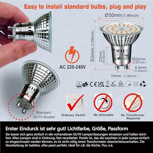 EACLL Lampadine LED GU10 Bianco Caldo 10W Equivalenti a 110W Alogena, Pacco da 6. No Flicker 120 ° Faretti, AC 230V Spot 2700K 1050 Lumen, 3 livelli Dimmerabile, 3 Luminosità con Funzione di Memoria