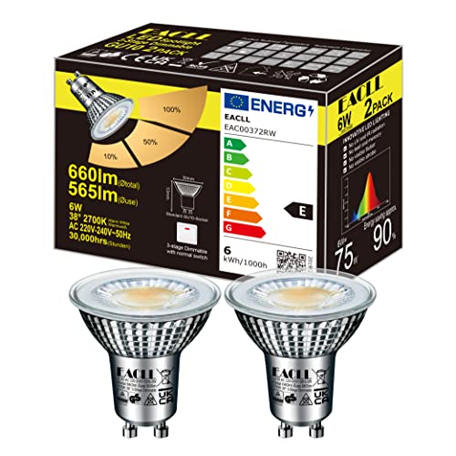 EACLL Lampadine LED GU10 6W 3 livelli Dimmerabile, Pacco da 2, Equivalenti a 75W Alogena, 565lm Bianco Caldo 2700K, Faretti senza Sfarfallio, 38° LED Spot, 3 Luminosità Dimmerabile senza Dimmer