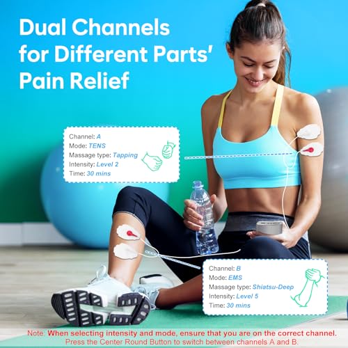 Ricaricabile TENS a Doppio Canale: 20 livelli di intensità per ogni canale. È possibile utilizzare due canali indipendenti con diverse impostazioni di intensità, modalità e tempo. Batteria ricaricabile agli ioni di litio, può essere utilizzata fino a 10 ore dopo una carica completa.