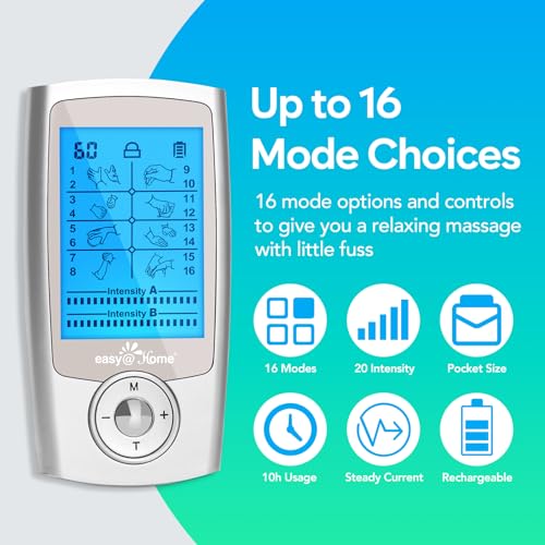 8 Modalità di Massaggio & 16 Programmi: Puoi goderti 8 modalità di massaggio professionale ovunque e in qualsiasi momento e puoi risparmiare migliaia di spese di massaggio. l'elettrostimolatore Easy@Home è dotato di 16 modalità Tens ed EMS preimpostato. Tutti possono godere di molti modalità combinando le modalità causmente.