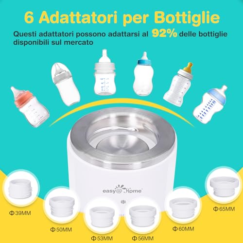 Dotato di 6 adattatori di dimensioni diverse, lo scaldabiberon è compatibile con fino al 92% di biberon (biberon con diametro di 39, 50, 53, 56, 60 e 65 mm) disponibili sul mercato. Si prega di scegliere l'adattatore adatto per abbinarlo al biberon del bambino prima dell'uso.